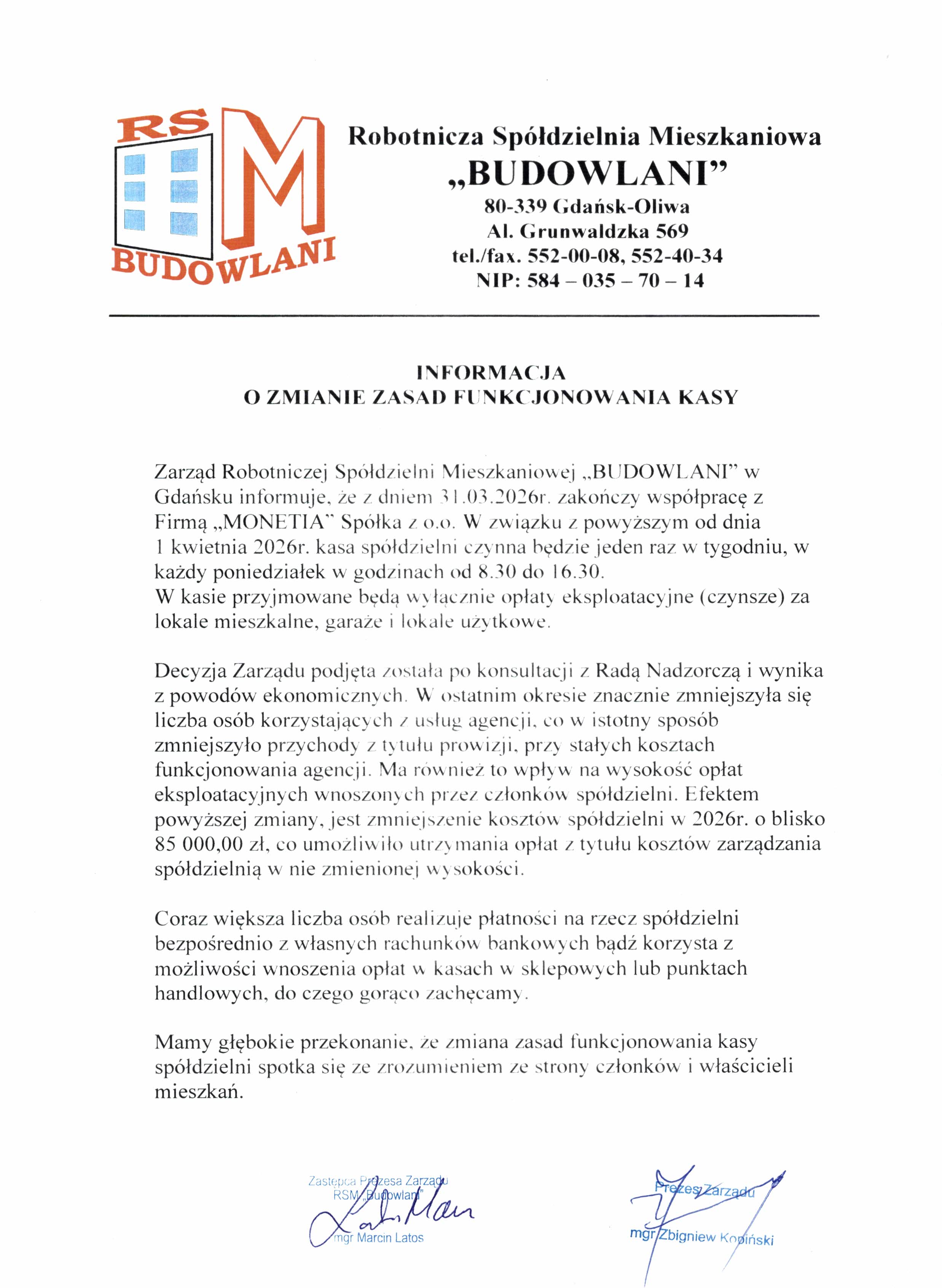RSM Budowlani informuje, że z dniem 01.01.2024 zmieniają się godziny urzędowania spółdzielni oraz kasy - Monetia:
