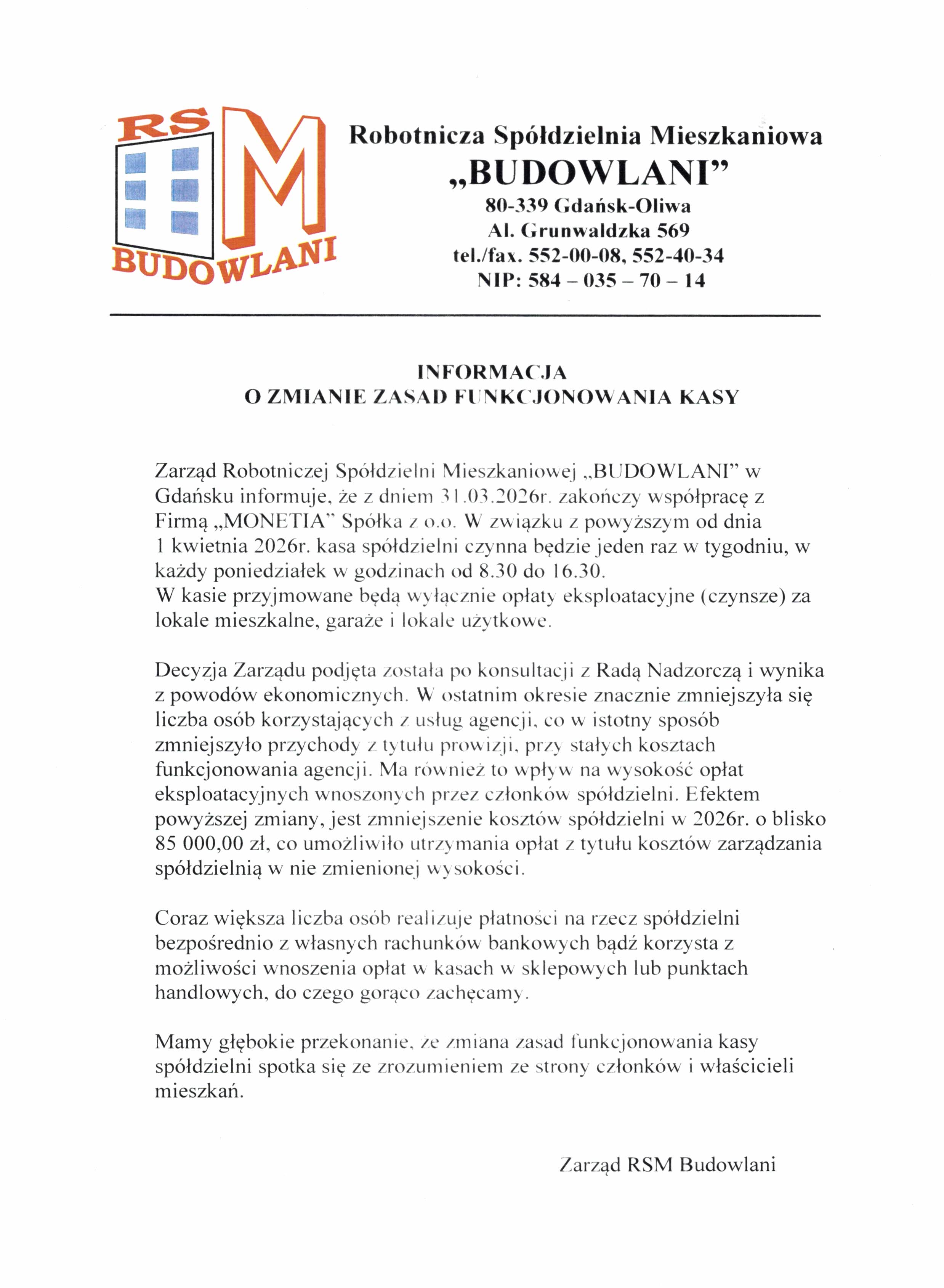RSM Budowlani informuje, że z dniem 01.01.2024 zmieniają się godziny urzędowania spółdzielni oraz kasy - Monetia: