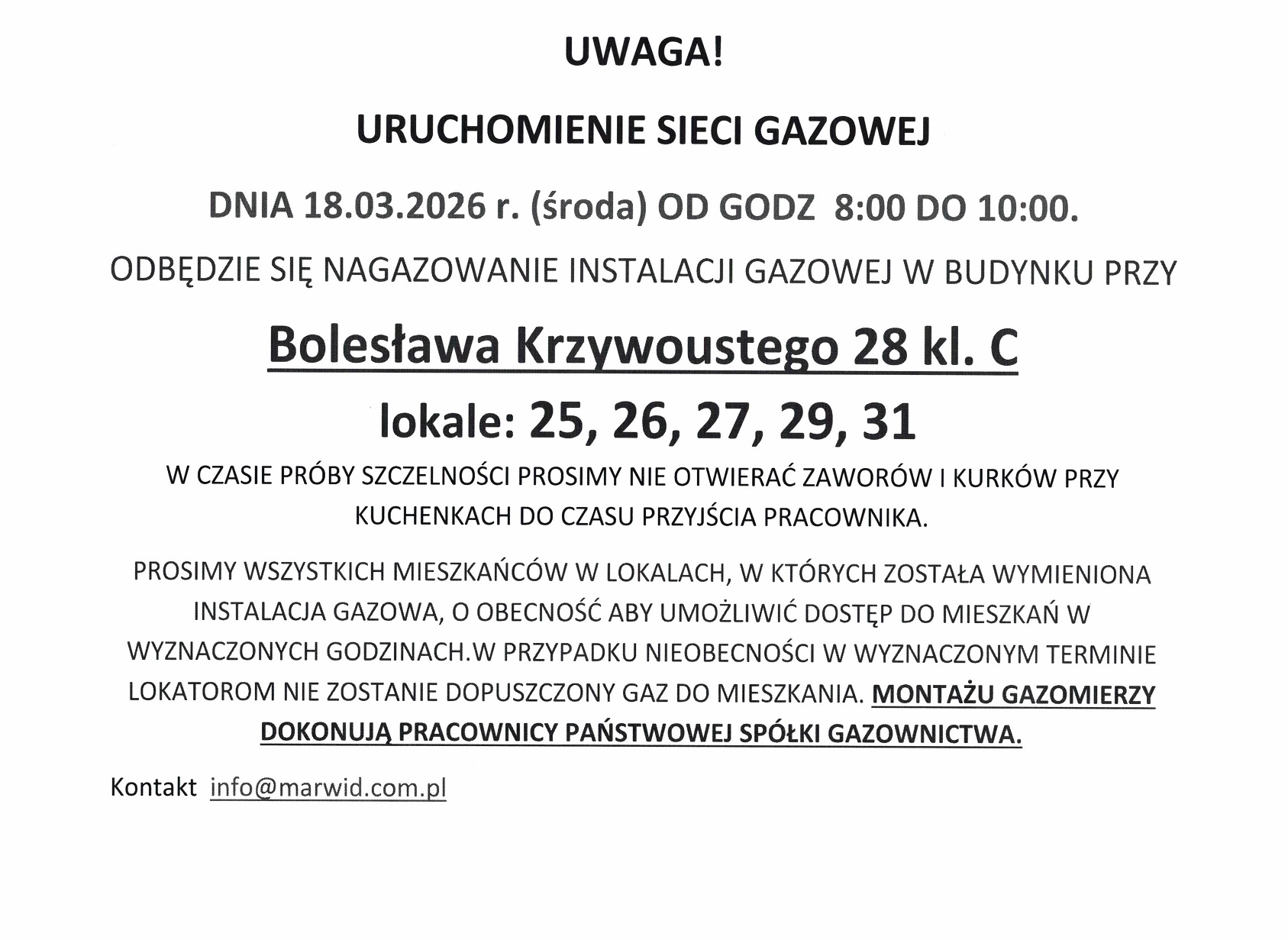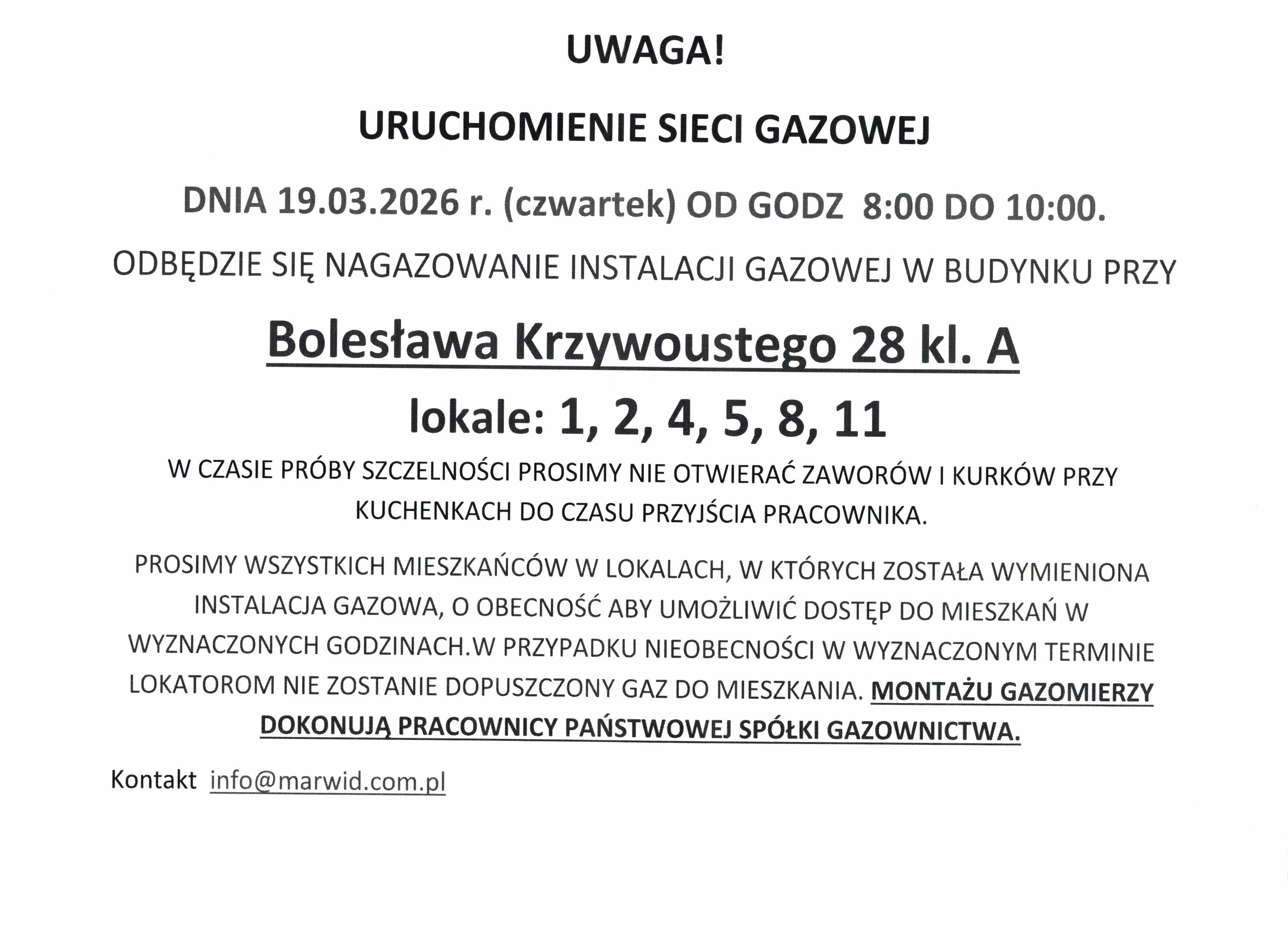 KOMUNIKAT W SPRAWIE GAZU NA UL. KRZYWOUSTEGO 28
